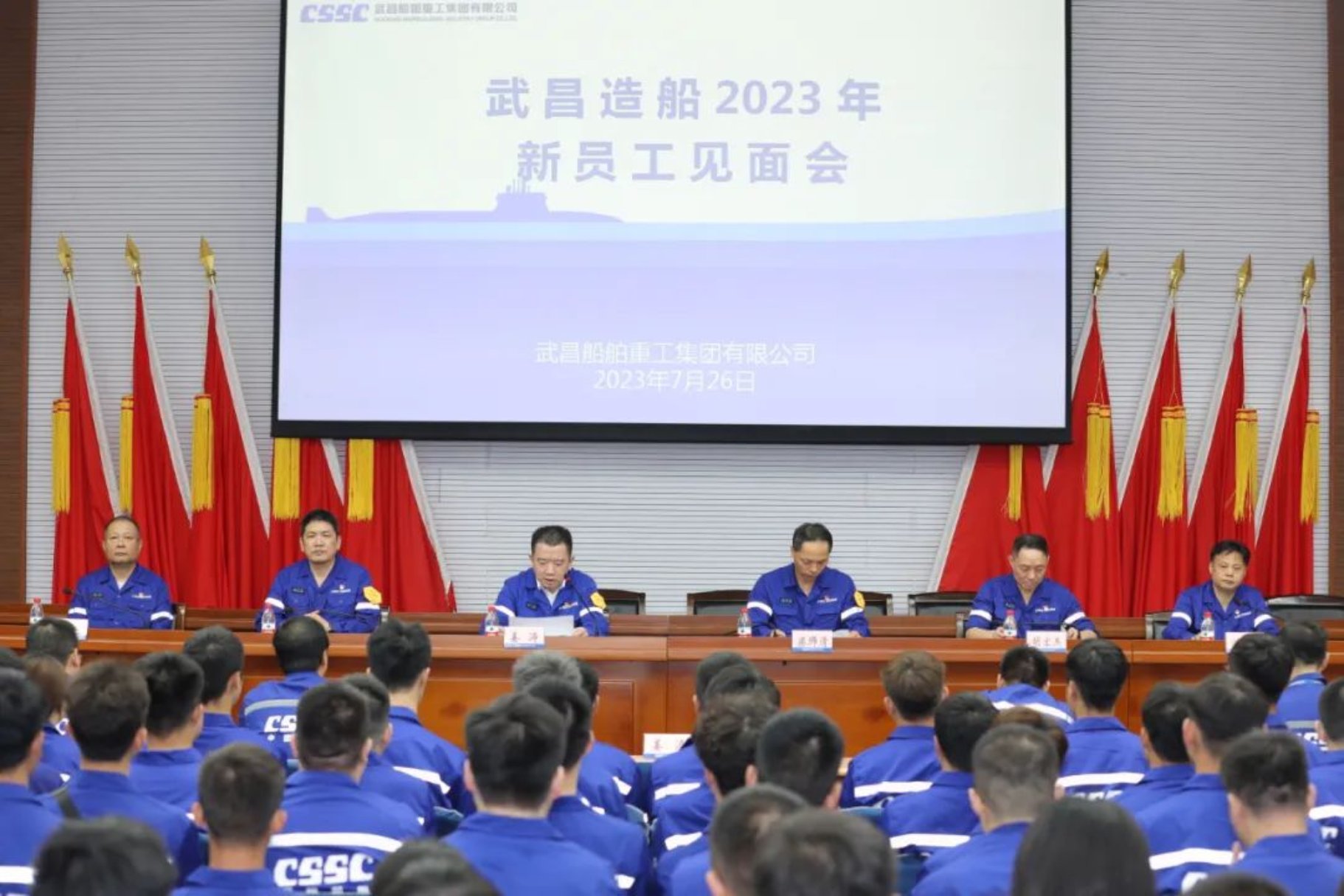 7月26日上午,中國船舶集團武昌造船2023年新員工見面會在學術報告廳舉行。公司黨委書記、董事長姜濤為新員工講授入職第一課,240名新員工聆聽授課。公司領導梁師清、陳仲明,公司總助級領導以及黨委工作部、公司團委、綜合管理部、人力資源部等部門負責人出席會議。