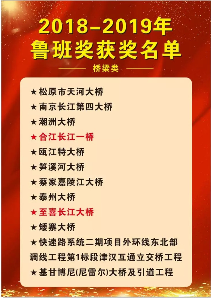 12月10日,建筑業(yè)科技創(chuàng)新暨2018-2019年度中國建設(shè)工程魯班獎(國家優(yōu)質(zhì)工程)表彰大會在北京舉行,共241項(xiàng)工程獲獎,武船重工股份承建的宜昌至喜長江大橋、四川合江長江一橋榜上有名。
