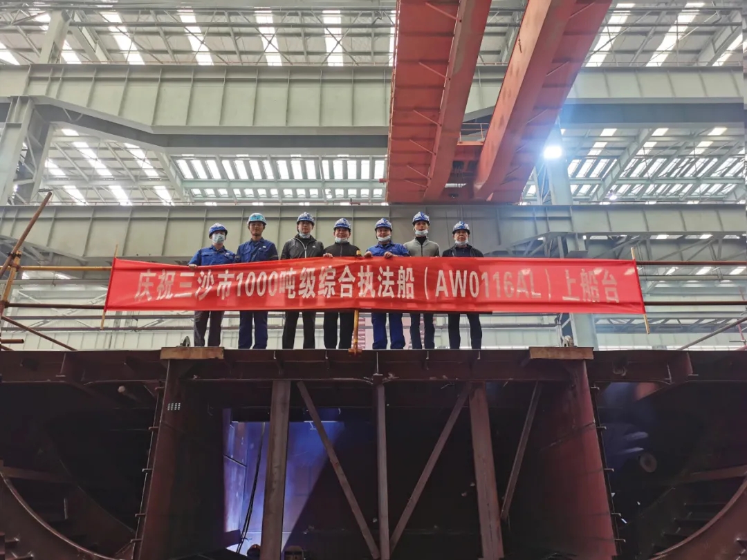 2020年10月19日,中國船舶武船集團(tuán)承制的三沙市1000噸級綜合執(zhí)法船首制分段順利上船臺。