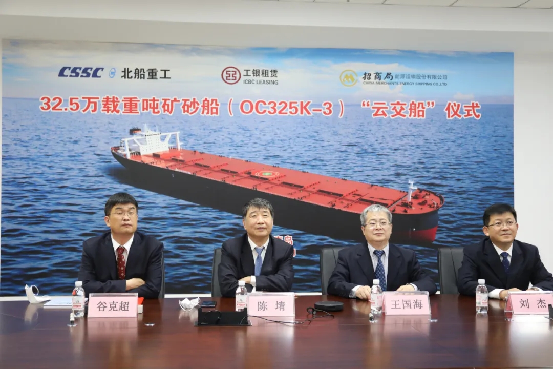 本次“云交船”儀式在北京、香港、武漢、青島4城5地同步舉辦,中國船舶集團副總經(jīng)理孫偉、招商輪船董事長謝春林、工銀租賃總裁趙桂才、武船集團董事長陳?較群籩麓牽?工銀租賃航運金融事業(yè)部執(zhí)行總經(jīng)理郭芳萌、武船集團北船重工總經(jīng)理谷克超代表雙方簽署了交船議定書,武船集團北船重工董事長王國海主持儀式。