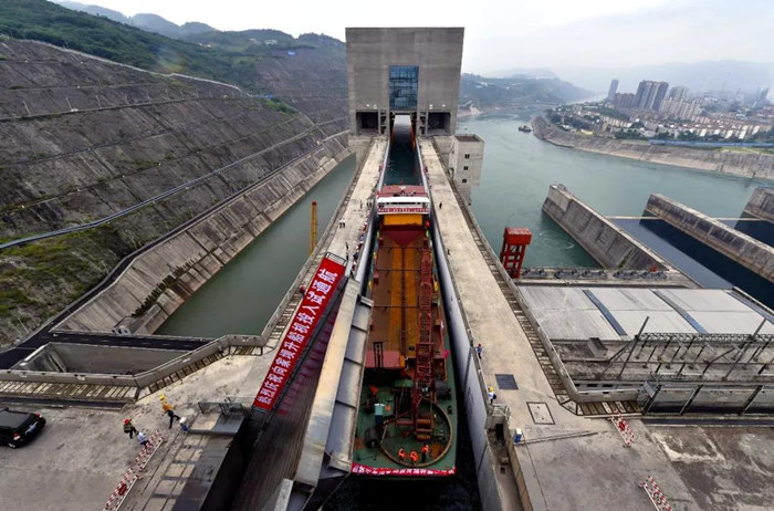 向家壩 升船機金結設備的制造、安裝、調試開始于2013年3月,歷時62個月,終于在今天成功對社會開放,開啟長江至金沙江的大門。試通航期間計劃每日通過4~8條船。這標志著長江黃金水道向上游金沙江流域延伸了175公里,途徑四川、云南兩省的7個縣,將長江黃金水道聯通至云貴川,開啟造福云貴川之路,起到“一帶一路”造福地方的作用。