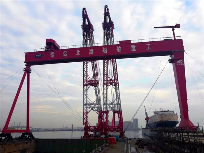 近日,武船集團北船重工1號修船塢原南塢墻拆除結束,原船塢與加長段順利實現打通,并迎來船塢加長貫通至430米后的首艘進塢修理船舶。與此同時,船塢配套500噸龍門起重機于9月20日安全順利的完成整體吊裝,至此1號修船塢升級改造項目兩大關鍵重要節點同期完成。