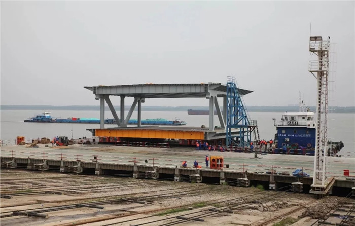 為確保裝船及運(yùn)輸萬無一失,裝船前,項(xiàng)目部經(jīng)過充分地準(zhǔn)備和論證,組織了楊泗港長(zhǎng)江大橋鋼桁梁主橋工程《鋼桁梁節(jié)段裝船運(yùn)輸方案》內(nèi)部和外部評(píng)審,編制《鋼桁梁節(jié)段裝船運(yùn)輸作業(yè)指導(dǎo)書》和《安全應(yīng)急預(yù)案》,進(jìn)行了模塊車并聯(lián)轉(zhuǎn)運(yùn)、上下排、船舶停靠、裝船試驗(yàn)等多個(gè)測(cè)試,掌握了精確的試驗(yàn)數(shù)據(jù),并多次方案優(yōu)化。