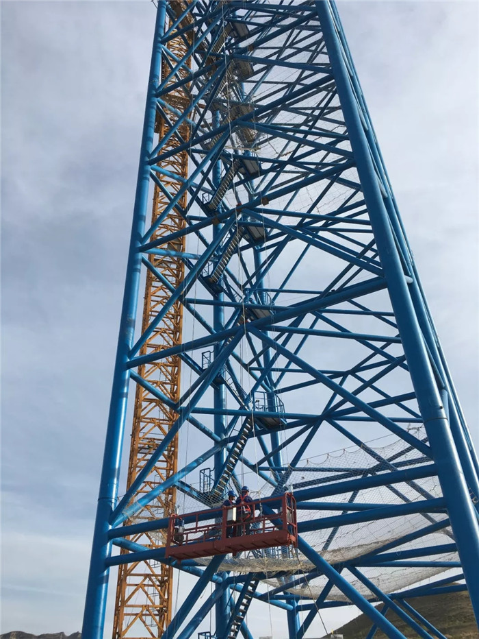 “為了確保著陸試驗能夠按計劃期限順利進行,武船集團重裝公司項目部在武漢、懷來兩地同時開工。一方面進行‘隨動盤’的制造和發運工作;另一方面進行鋼絲、絞車、導向輪組等配套電氣設備、設施的制造和安裝工作。”雷洪洲說道:“試驗場址設立在丘陵環繞的腹地中心,那兒矗立著6個圍成圓形的140米高鋼結構塔架。我們的施工人員需要克服強烈的心理恐懼,借助建筑吊籃上升至百米甚至更高的區域,進行導向輪組、鋼絲等設備的裝焊作業。”