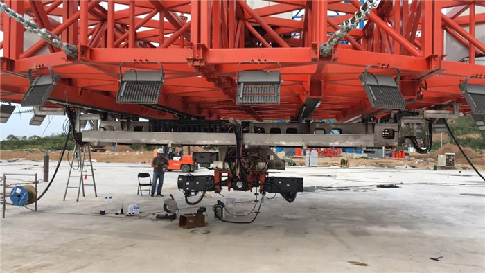 2019年7月初,“隨動盤”在武船集團重裝公司廟山基地順利完成組裝及檢測實驗,并立即拆分裝箱發往懷來。“隨動盤”上安裝的導軌平面度公差達到0.1mm、平行度公差達到0.15mm ,各項檢測數據滿足工藝精度及試驗要求。