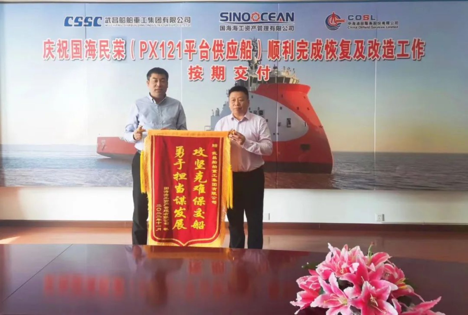 2022年11月7日,由中國船舶武船建造的PX121H型平臺供應船“國海民榮”輪,在武船南通順融重工碼頭順利交付。本船是4艘PX121H型平臺供應船的最后一艘,至此武船成功盤活該型產(chǎn)品全部海工資產(chǎn)。