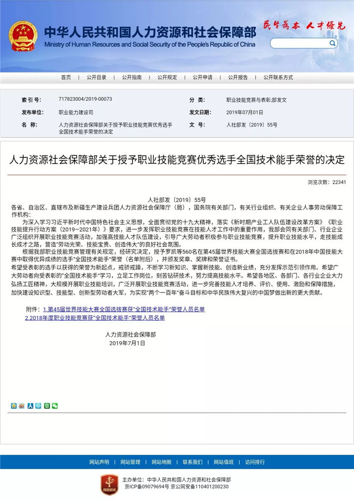 日前,人社部決定授予在第45屆世界技能大賽全國(guó)選拔賽和在2018年中國(guó)技能大賽中取得優(yōu)異成績(jī)的選手“全國(guó)技術(shù)能手”榮譽(yù),并頒發(fā)獎(jiǎng)?wù)隆ⅹ?jiǎng)牌和榮譽(yù)證書(shū)。
