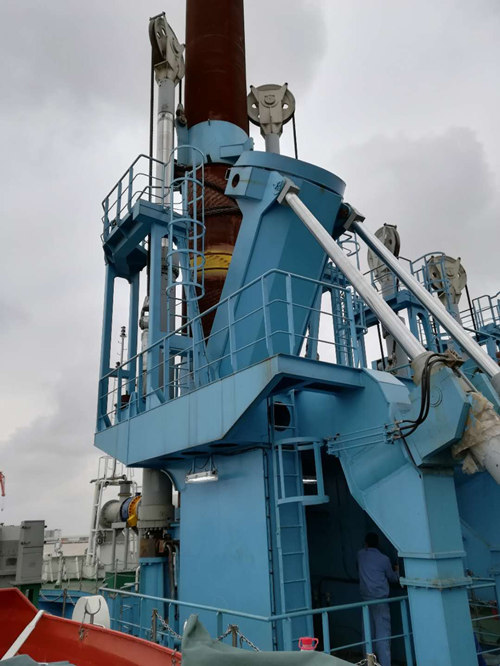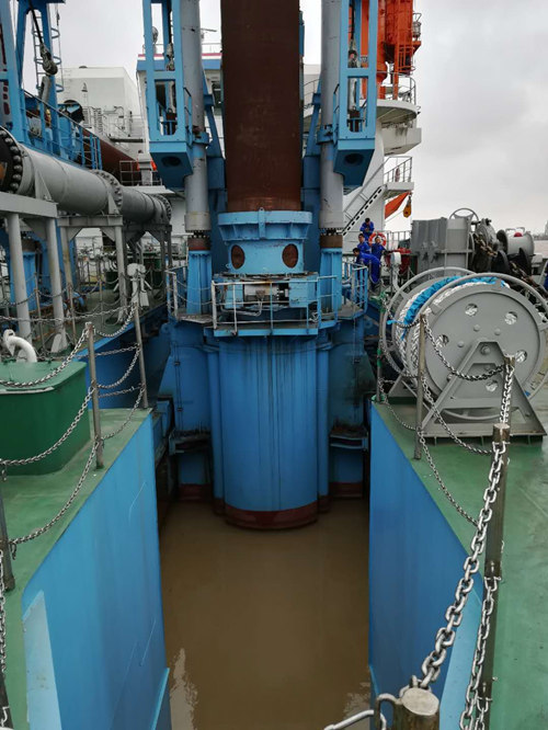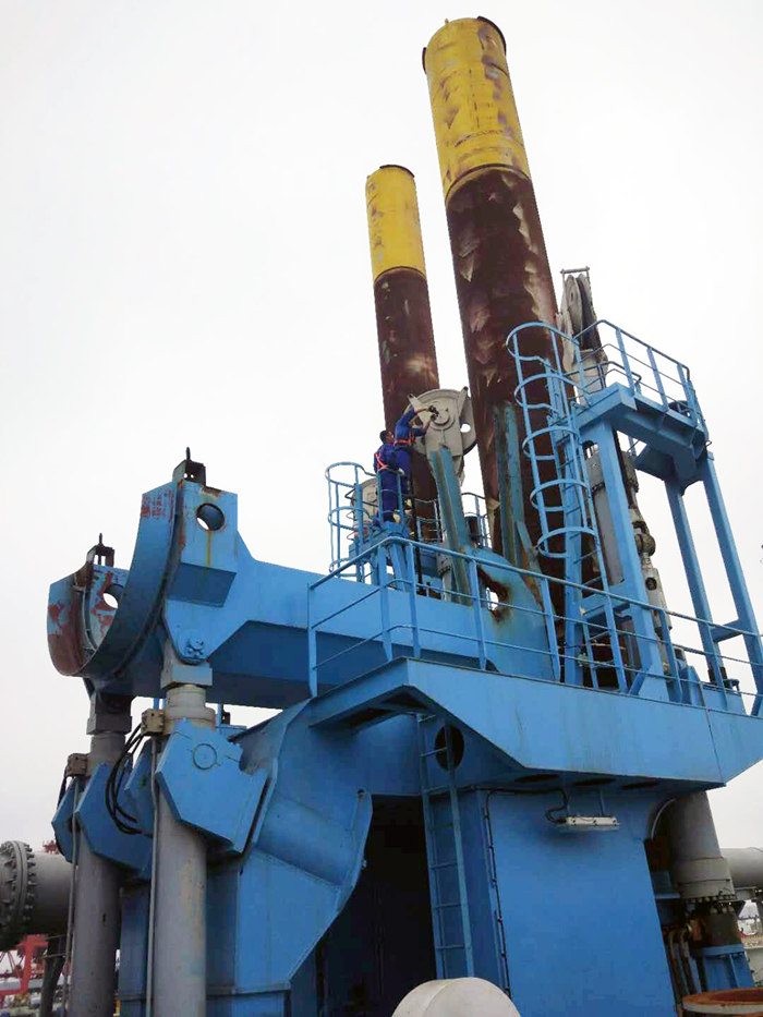 鋼樁定位系統安裝在挖泥船艏部,由高達42米的主輔鋼樁部套以及臺車系統組成,用來“鎖定”浮在水面的挖泥船,實現挖泥船持續穩定絞吸水底泥沙。