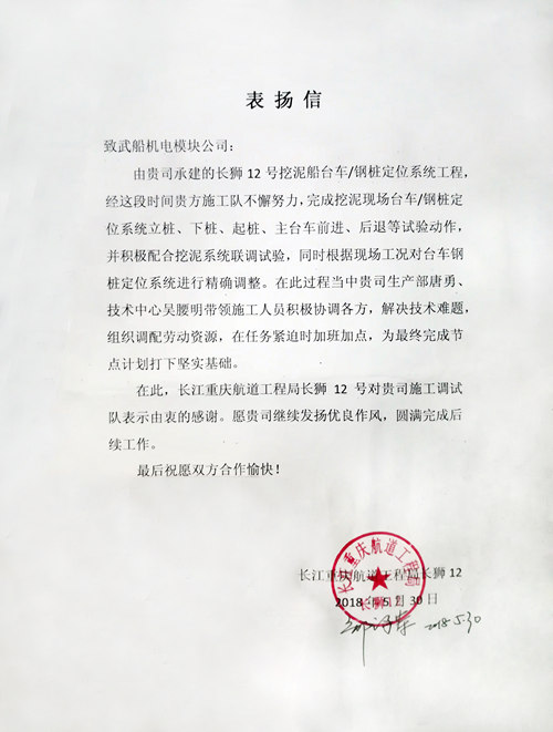 長江重慶航道工程局“長獅12”挖泥船船長鄒澤榮發來表揚信,贊譽武船集團模塊公司鋼樁定位系統項目團隊,感謝項目團隊一舉一動為用戶著想,贊揚項目團隊克服周期緊、任務重、難點多等急難因素,高效精準解決了多項技術難題,高質量完成了鋼樁定位系統聯調試驗任務。鋼樁定位系統聯調試驗現場負責人唐勇表示,武船集團模塊公司項目團隊將按照“100+1”質量理念,做好后續鋼樁定位系統和絞吸挖泥聯合調試任務,打造精品工程。