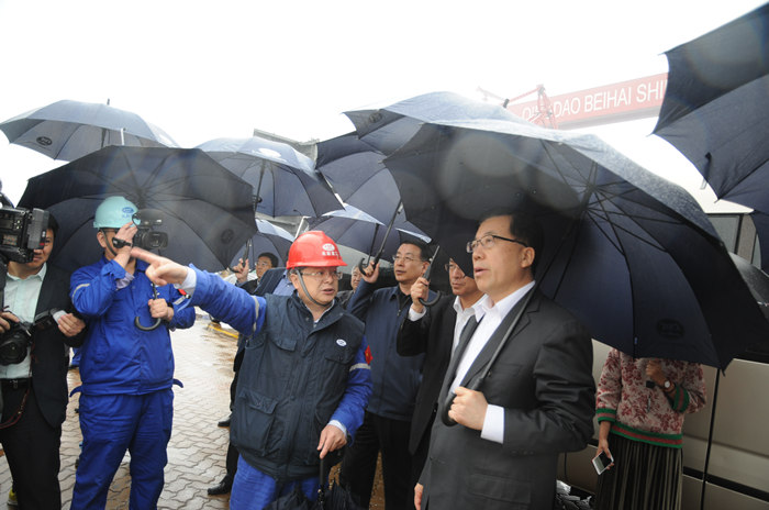 5月11日下午,山東省委常委、青島市委書記張江汀,市委常委、副市長王魯明,市委常委、西海岸新區黨工委書記、區委書記王建祥等領導一行到武船集團北船重工調研企業科技創新、發展海洋經濟等工作。
