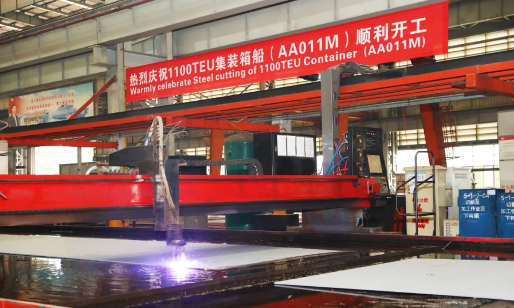 5月17日11時(shí)18分,武昌造船為希臘船東Cosmoship建造的1100TEU集裝箱船首制船在雙柳廠區(qū)順利開(kāi)工。船東代表、BV船級(jí)社、中船貿(mào)易相關(guān)領(lǐng)導(dǎo)及公司相關(guān)部門(mén)代表、產(chǎn)品三總師參加開(kāi)工儀式。
